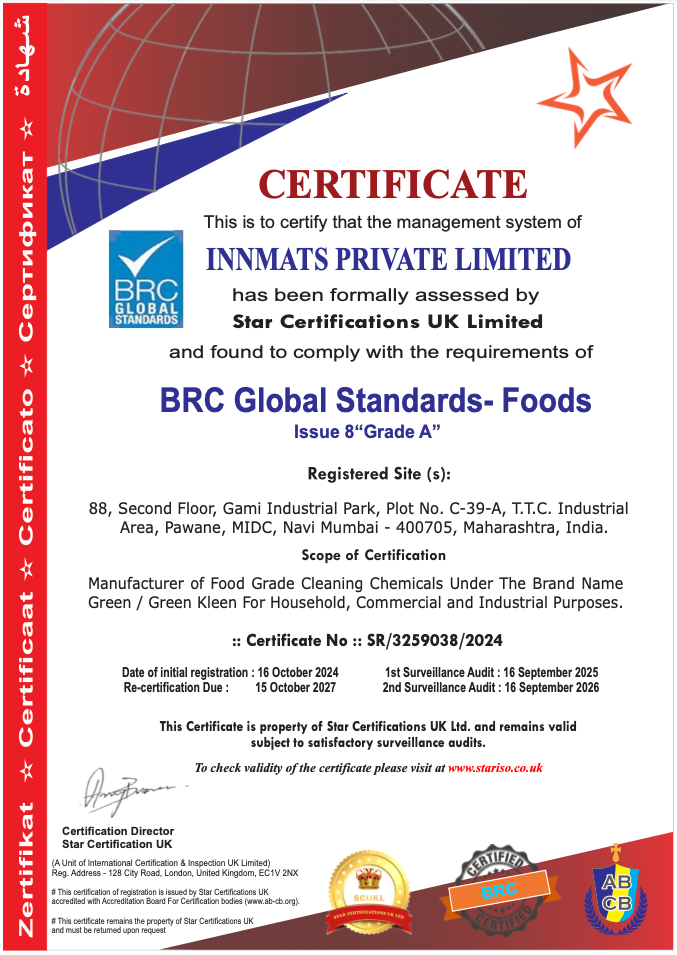 Compliance with BRC-Global standards - Foods certification. Scope : Manufacturer of cleaning products for household, commercial and Industrial purposes.