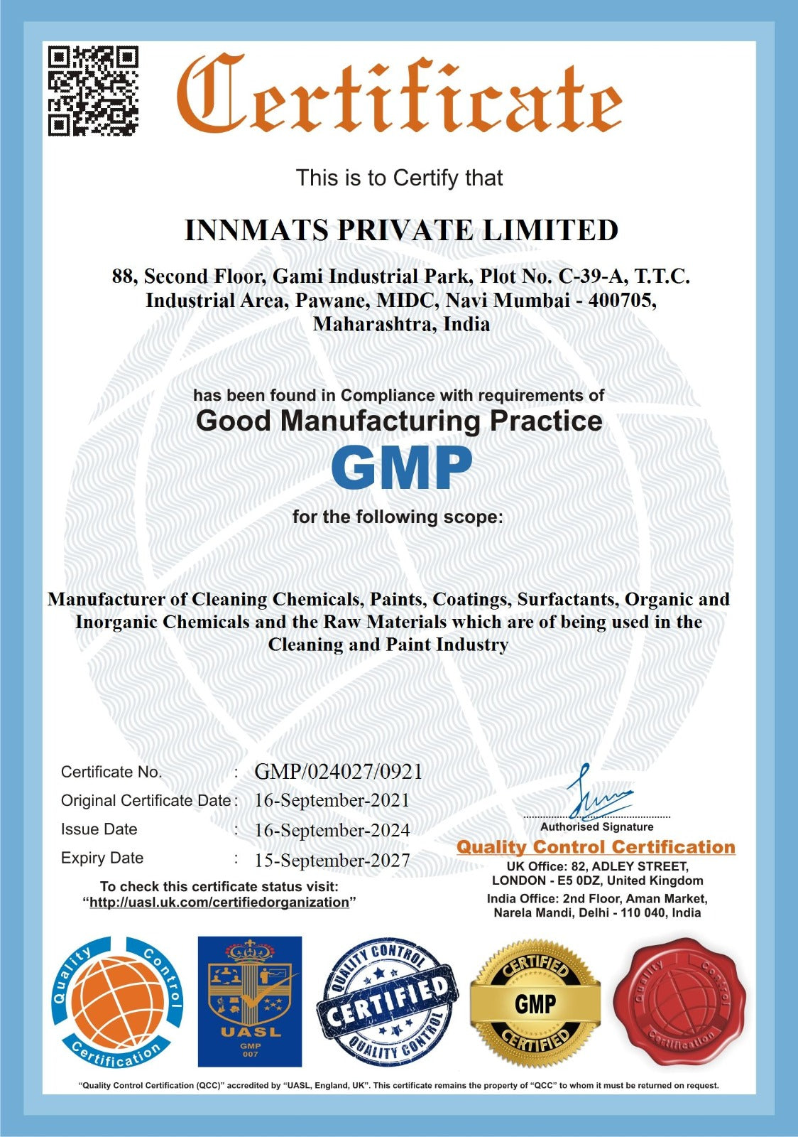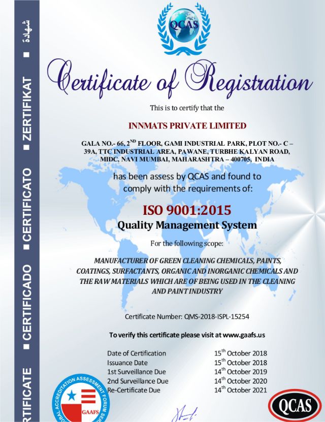 Certification scope: Manufacturer of Cleaning Chemicals, Paints, Coatings, Surfactants, Organic and Inorganic Chemicals and the Raw Materials which are of being used in the Cleaning and Paint Industry